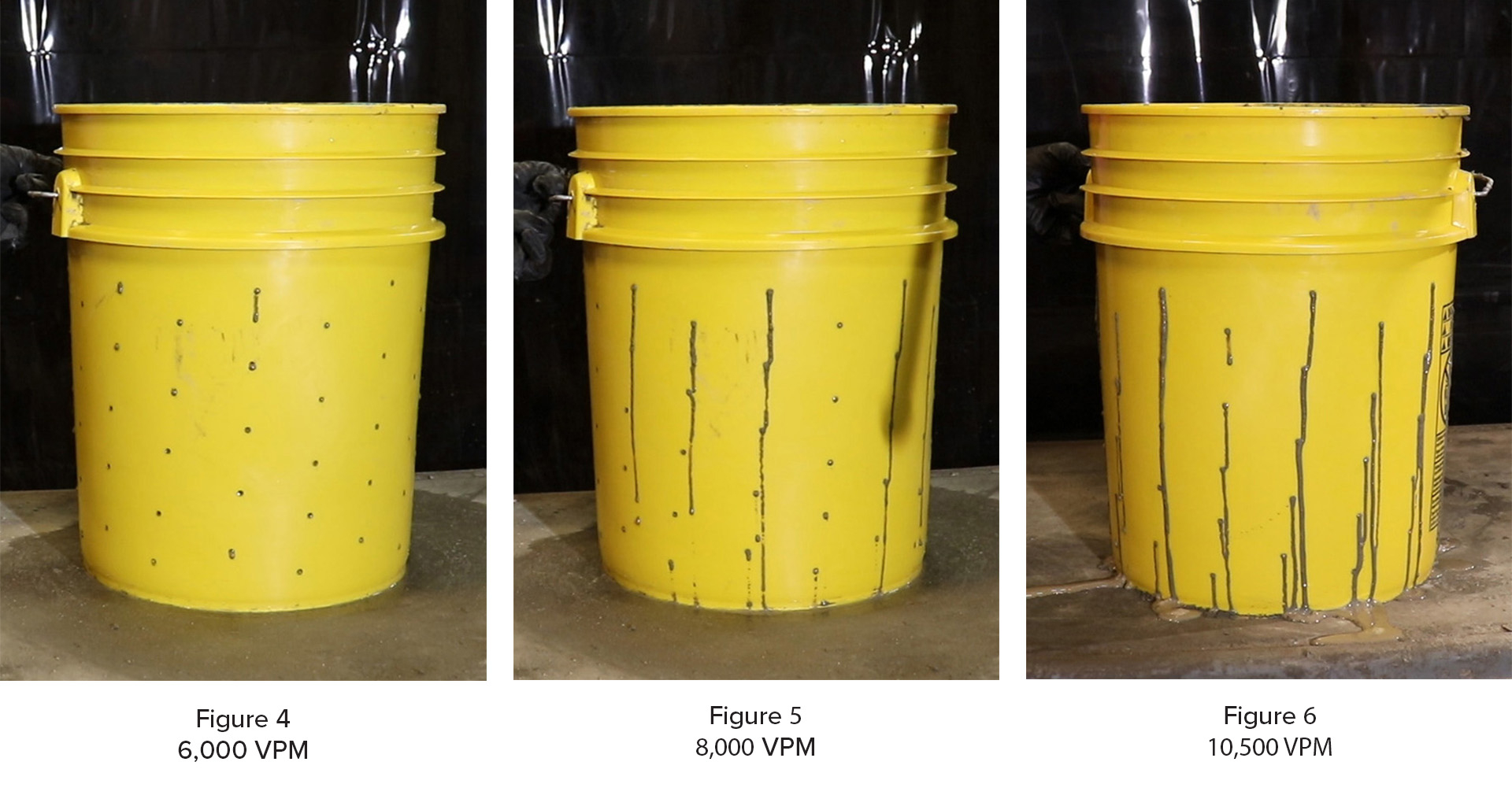 Testing has shown that simply reducing vibrator speed decreases material separation, as illustrated in Figures 4–6 (bucket test). Notice the amount of water driven through the holes in the bucket at each speed. On a larger scale, water separation becomes even more apparent when vibrator speeds are too high. You may observe water being driven out of the bottom of the form and pooling.